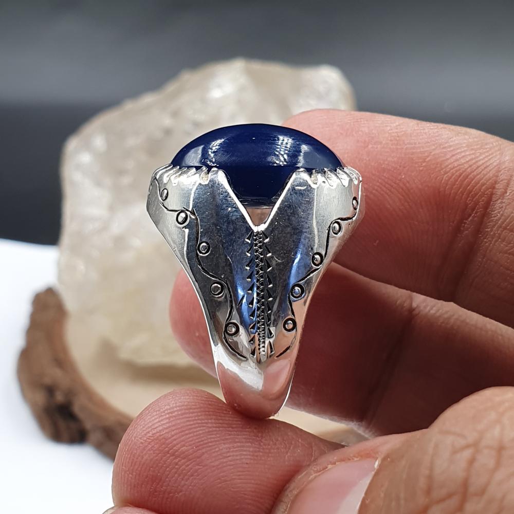 خاتم عقيق يماني ازرق صياغه موديل حجازي