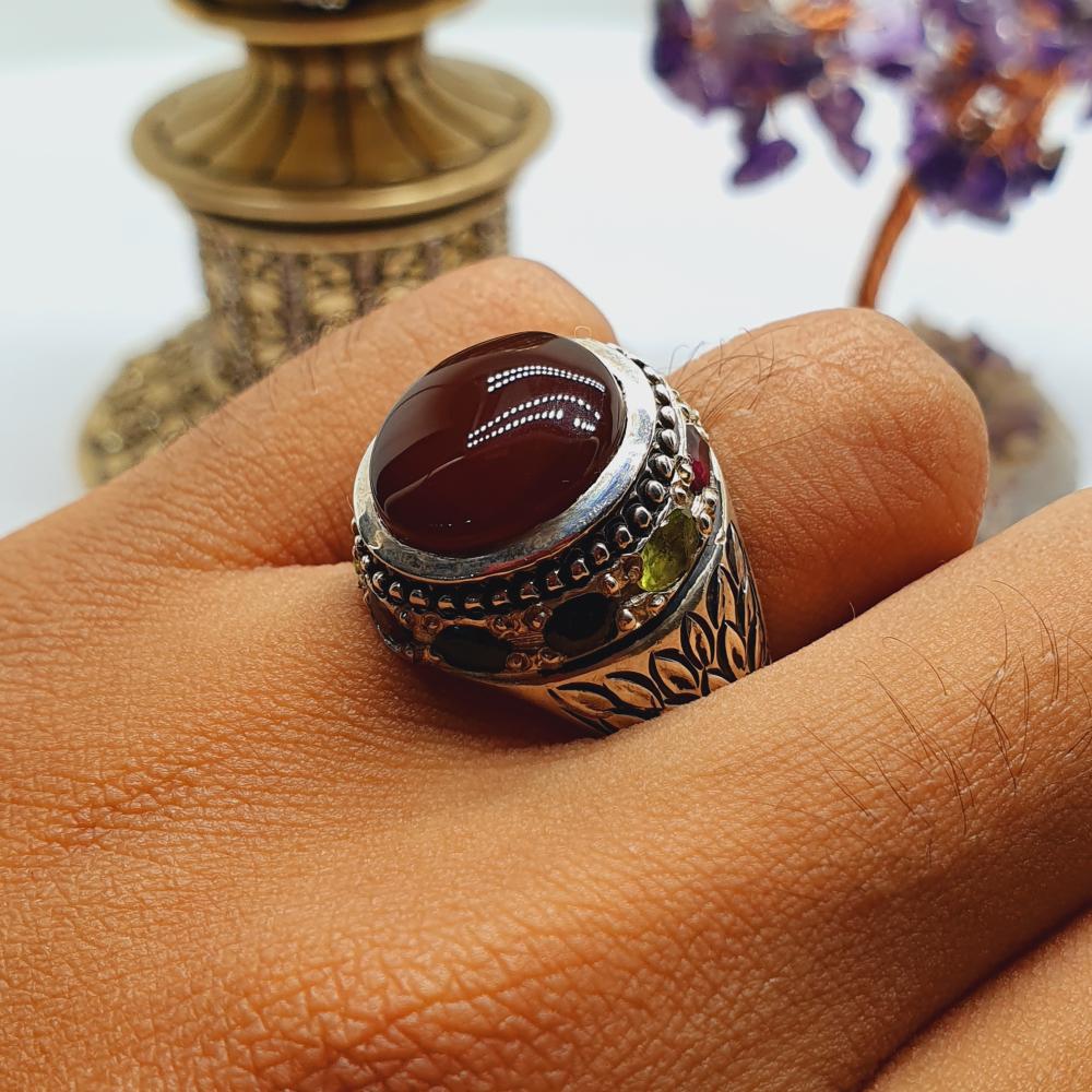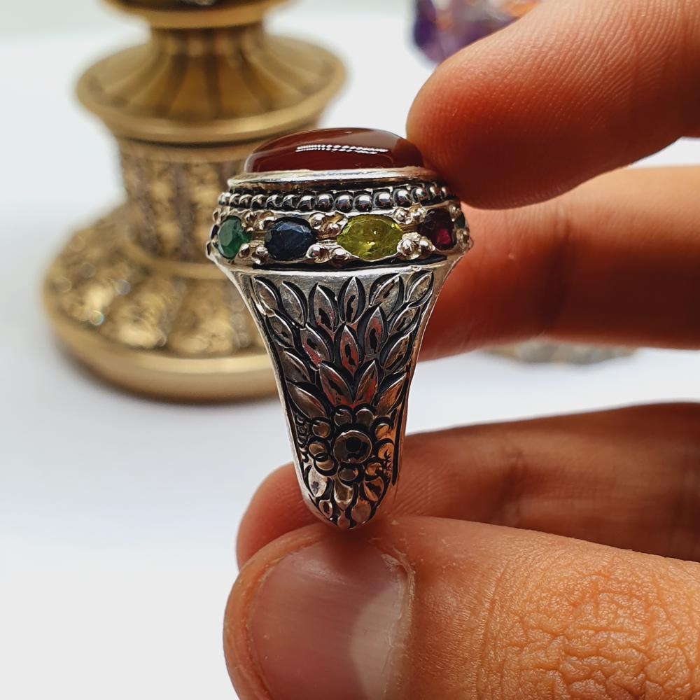خاتم عقيق كبدي مرصع بالاحجار الكريمه نقش يدوي