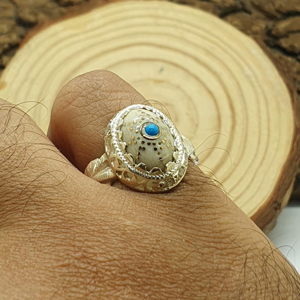 خاتم عاج الفيل مطعم بالفضه والفيروز مرصع بالزركون السويسري موديل ملكي فاخر
